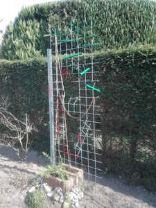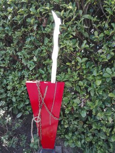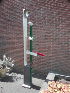 2020Installatie gemaakt in het kader van herdenking 75 bevrijding. Het hekwerk, de ketting en het touw staan symbool voor het gevangenkamp. De opening in het hekwerk staat voor de bevrijding. De rode kleur in de linker onderhoek geeft het lijden weer, terwijl het groen in de rechter bovenhoek het ontluiken van de vrijheid weergeeft. materialen: metaal, touw en beton
