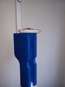 2021hout, steen, plastic, touw Het beeld geeft een impressie van het moderne leven. Er is geen tijd meer voor om aan tafel te eten. we eten steeds meer met het ontbijt op schoot bij de tv.